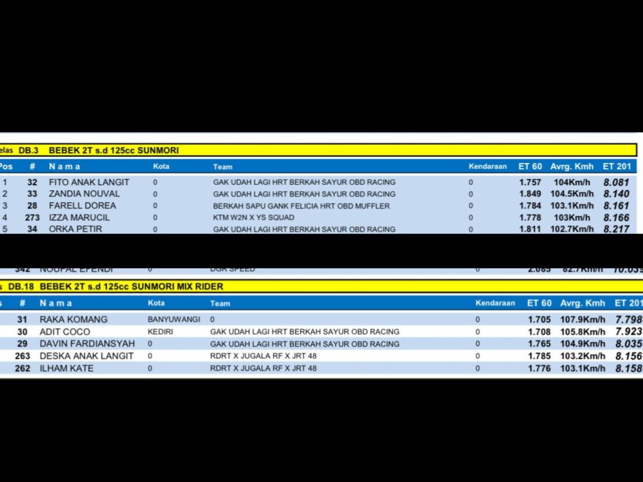 “Untuk time kemarin memang sangat tajam, saya juga kaget bisa 7,7 detik yang biasa nya 8.0 detik. Mungkin ada error timing atau kebantu angin. Tapi memang semua kelas turun, bukan cuma Fiz R. Ninja Sunmory yang biasanya 7,1–7,2 detik kemarin bisa 6,9 detik,” jelas Rully.