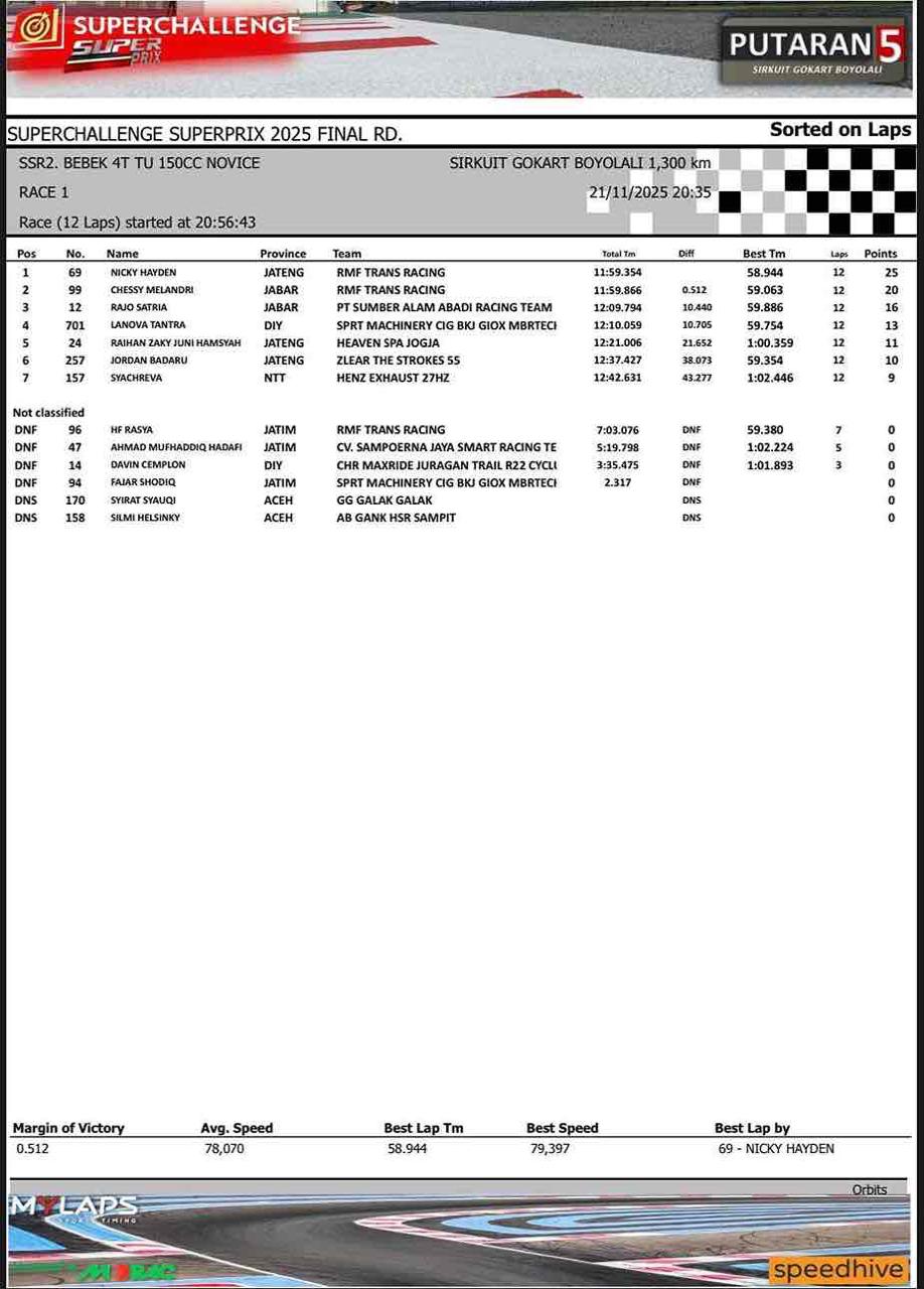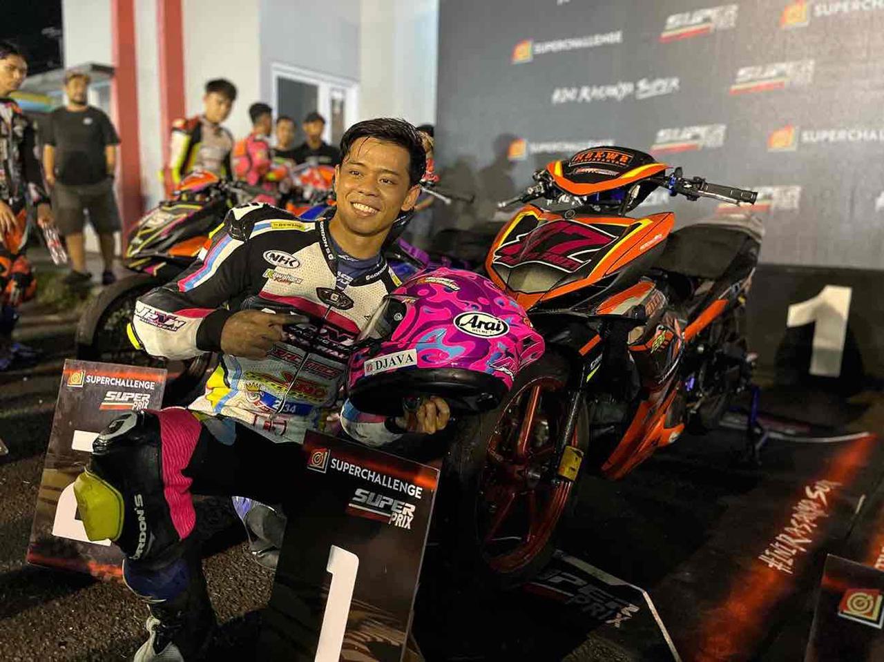Otoracing.Net – Boyolali. Nicky Haiden tampil impresif dan berhasil mengamankan podium tertinggi pada kelas Bebek 4Tak 150cc Novice (MP2) di ajang Final Superchallenge Super Prix Boyolali. Race 1 yang digelar pada Jumat malam, 21 November 2025 di Sirkuit Gokart Boyolali.