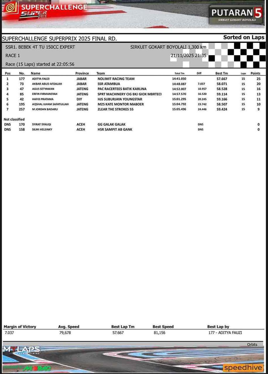 Otoracing.Net – Boyolali. Pembalap asal Tasikmalaya, Aditya Fauzi yang kali ini turun bersama No Limit Racing Team asal Medan. Sukses tampil gemilang pada race 1 bebek 4tak 150cc expert di final Superchallenge Super prix Jum’at 21 November, 2025.