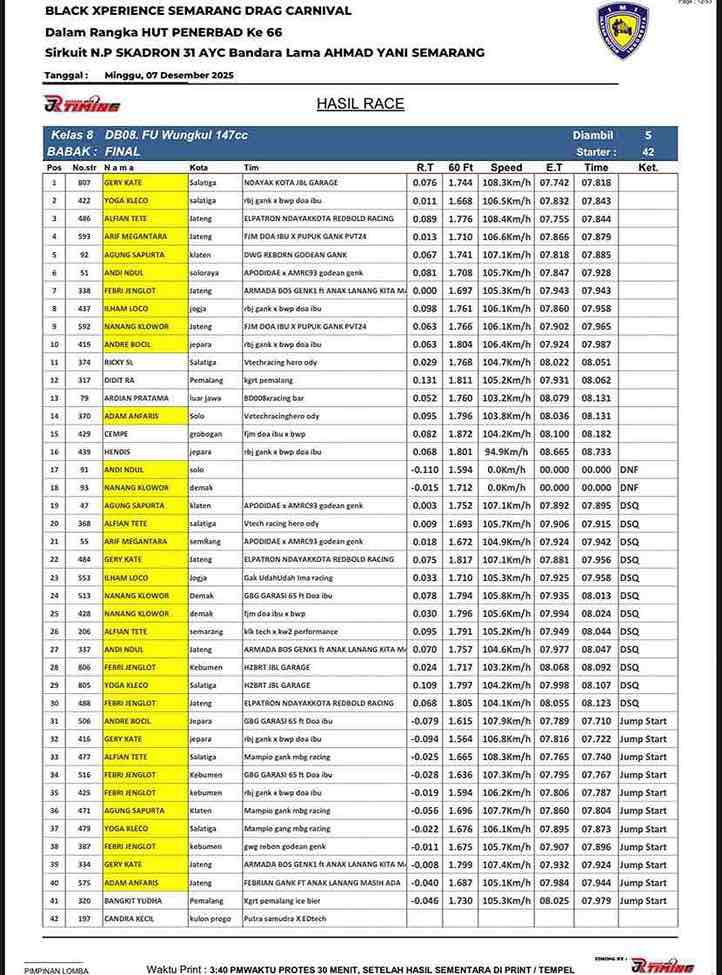 Otoracing.Net – Semarang. Motor FU Wungkul El Patron milik tim Ndayak Kota JBL Garage kembali tampil beringas dan sukses mencatatkan podium satu dan tiga di ajang Semarang Drag Carnival (SDC) yang berlangsung di Sirkuit NP. Skadron 31 AYC Bandara Ahmad Yani, Semarang (07/09/2025).