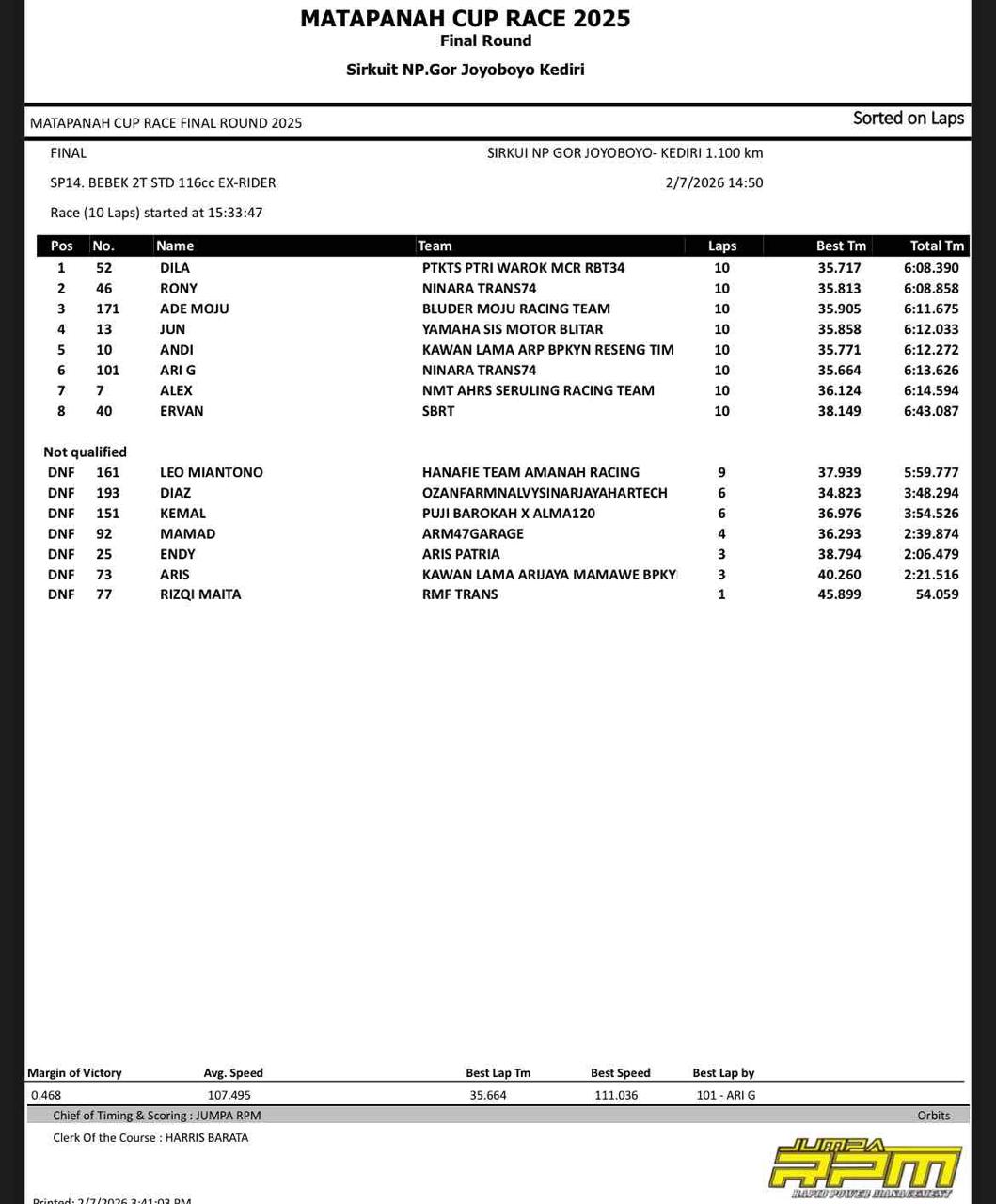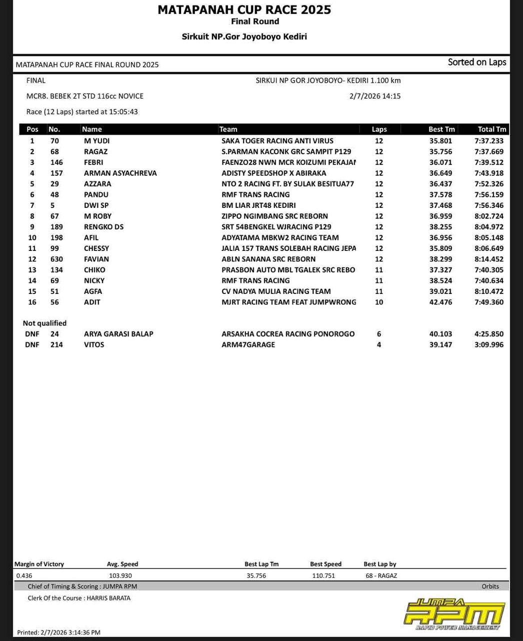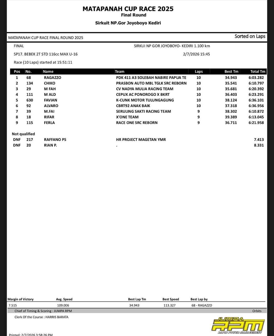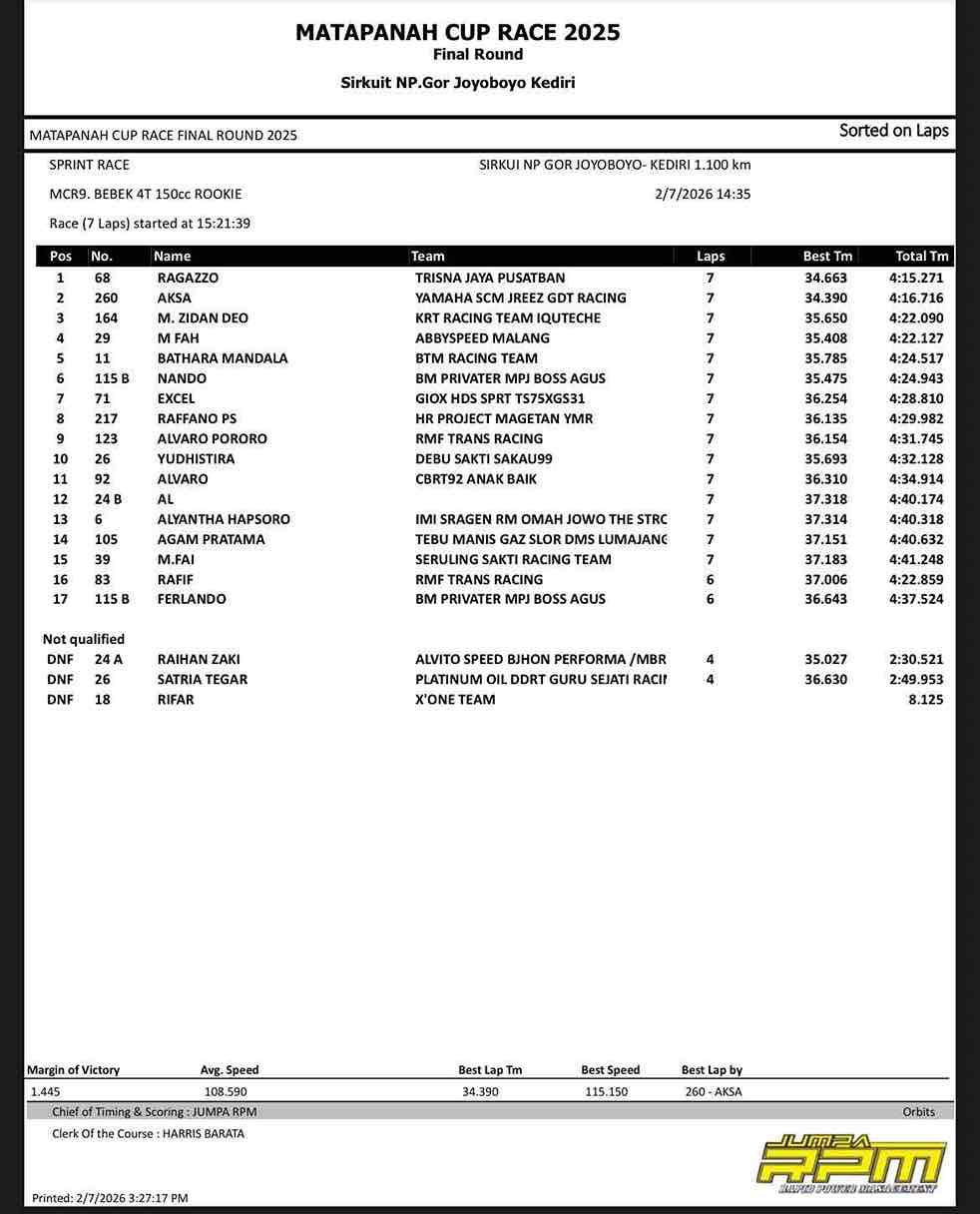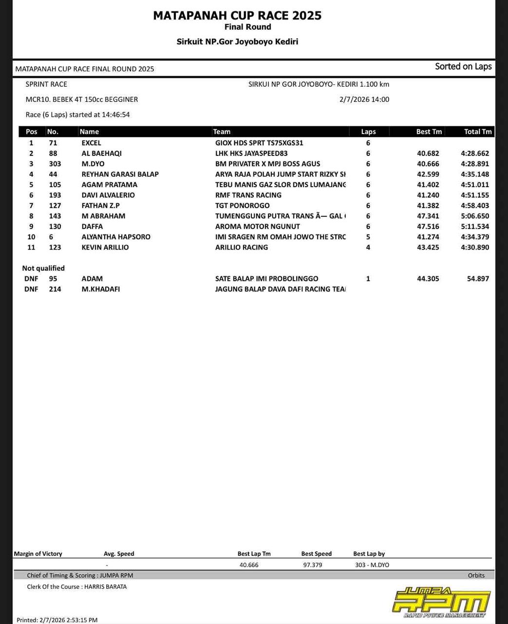Otoracing.Net – Kediri. Berikut merupakan hasil Sprint race dan Juara hari pertama kejuaraan Final Matapanah Cup Race (MCR) 2025, yang berlangsung di Sirkuit NP. Gor Jaya Baya Kediri (07/02/26).