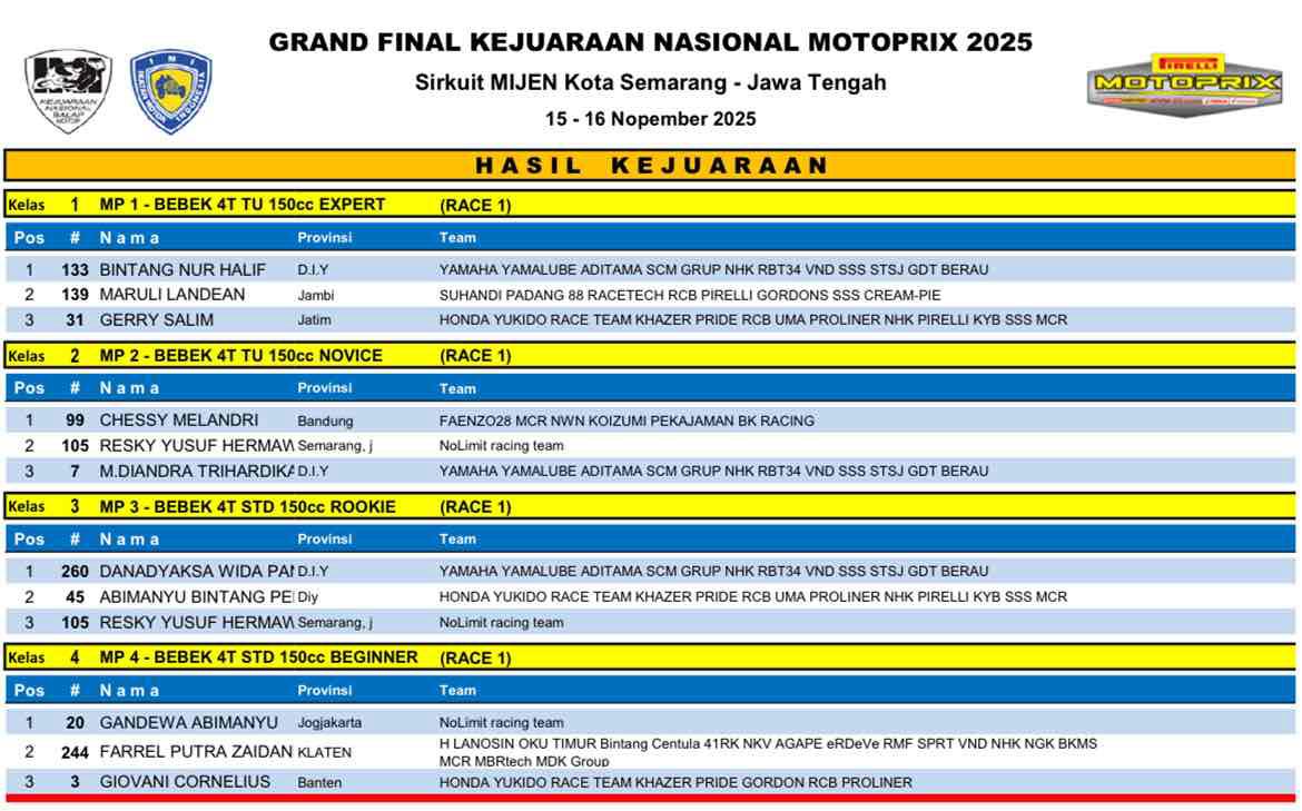 Otoracing.Net – Semarang. Berikut merupakan hasil juara race 1 Grand Final Motoprix 2025, yang berlangsung di Sirkuit Mijen, Semarang (15/11/25).