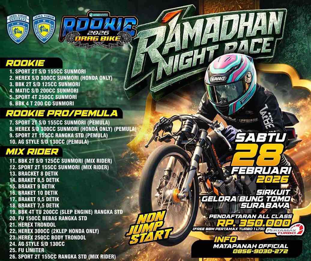 Otoracing.Net – Surabaya. Ajang balap lurus 201 meter persembahan Matapanah Official bertajuk Ramadhan Night Race Rookie 2026 siap digelar akhir pekan ini, Sabtu 28 Februari 2026, di Sirkuit GBT, Surabaya.