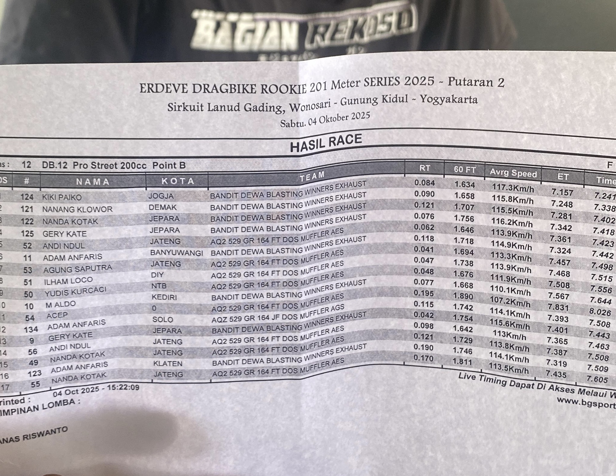Pada gelaran Erdeve Dragbike Rookie 201M Series 2025 Putaran 2 yang berlangsung di Sirkuit Lanud Gading, Wonosari – Gunungkidul, Yogyakarta, Sabtu (04/10/2025), motor MX King berkelir biru putih tersebut sukses mencatatkan ET 7.157 detik dan RT 7.241 detik lewat aksi impresif Kiki Paiko.