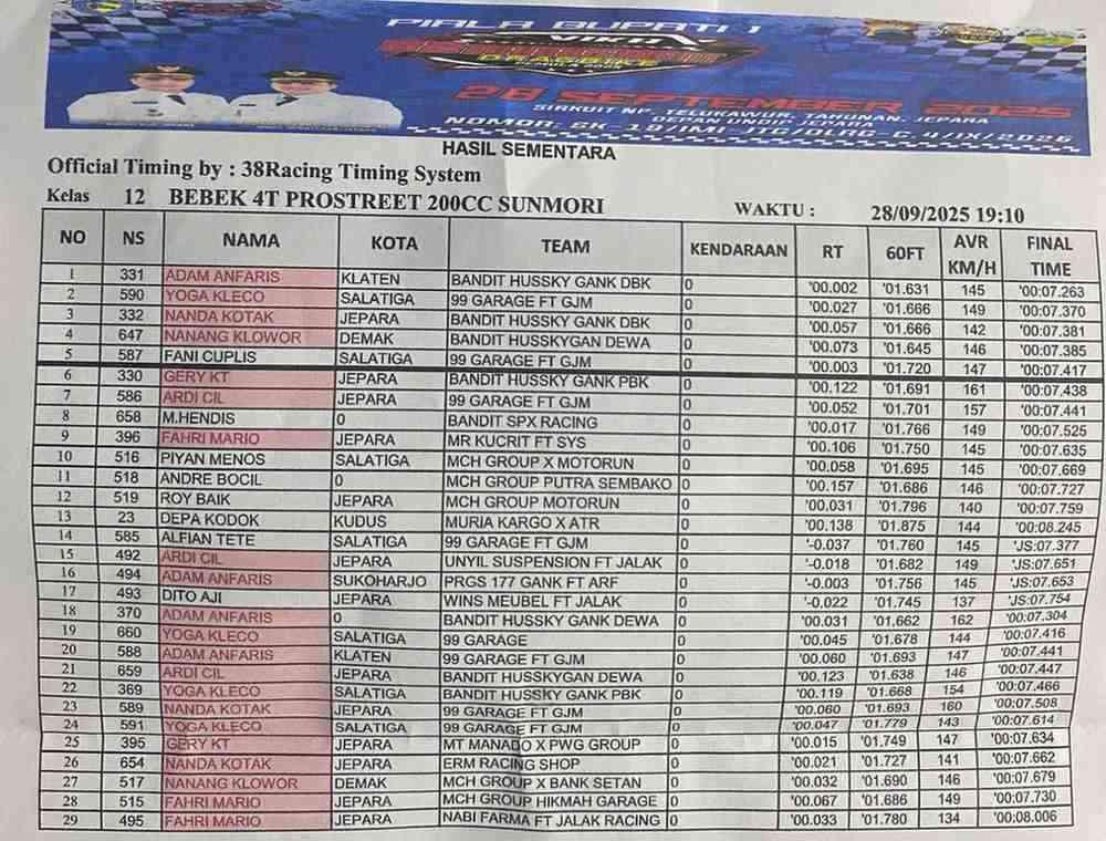 Otoracing.Net – Jepara. Ajang Piala Bupati Vika 82 Management Dragbike yang digelar di sirkuit NP. Telukawur Tahunan, Jepara, akhir pekan ini menjadi saksi lahirnya catatan waktu impresif di kelas Prostreet MX King 200cc.