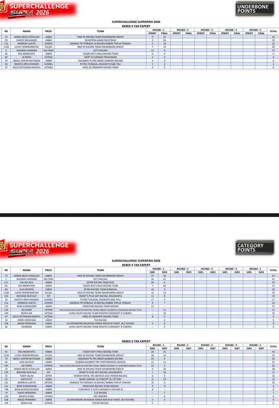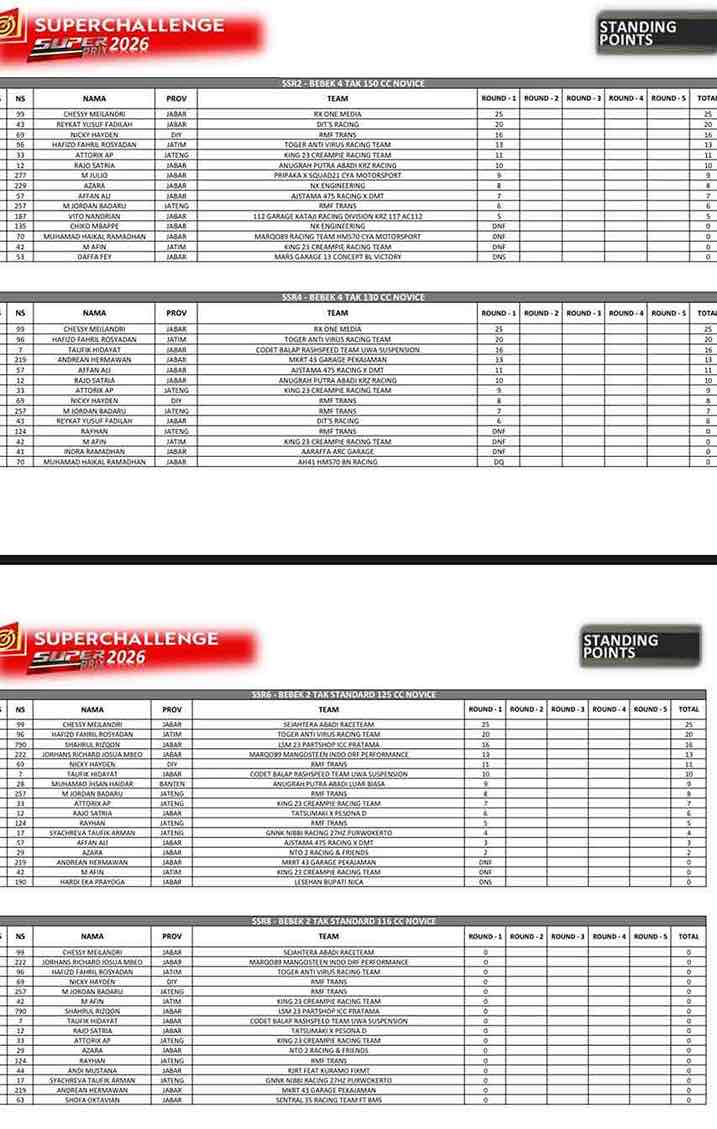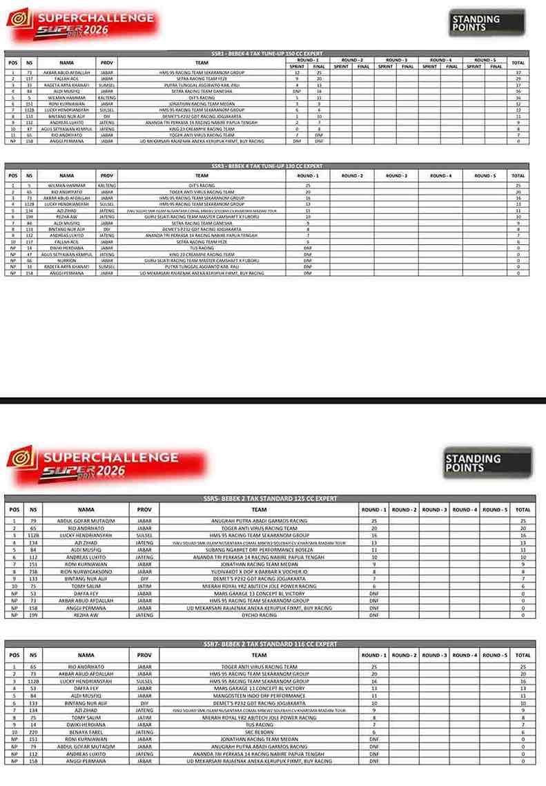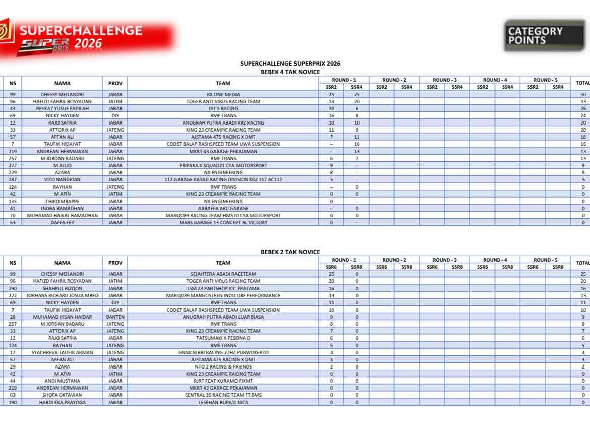 Otoracing.Net – Tasikmalaya. Berikut merupakan standing point ajang Superchallenge Super Prix 2026 Seri 1 yang berlangsung di Sirkuit Bukit Peusar. (10-11/04).