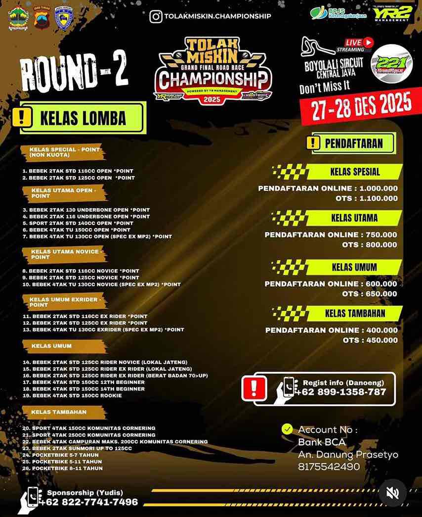 Otoracing.Net – Boyolali. YR Tolak Miskin Racing Team memastikan turun dengan full squad dan mengusung formasi menyerang pada ajang Tolak Miskin Road Race Championship Round 2 yang akan digelar di Sirkuit Gokart Boyolali, pada 27–28 Desember 2025.